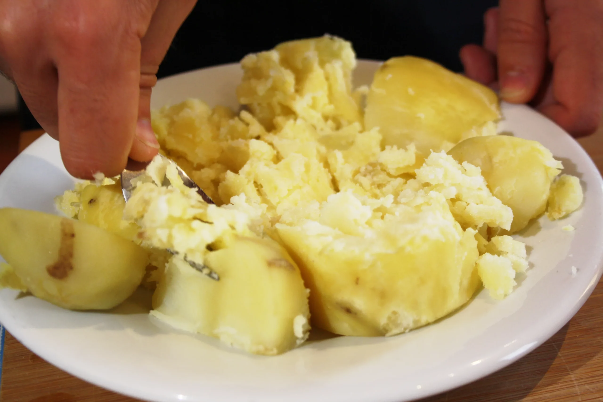 - Després que hagin refredat una mica, esclafam les patates amb la forqueta. Convé fer-ho repetides vegades per tal d’evitar que quedin trossos grossos de patata.