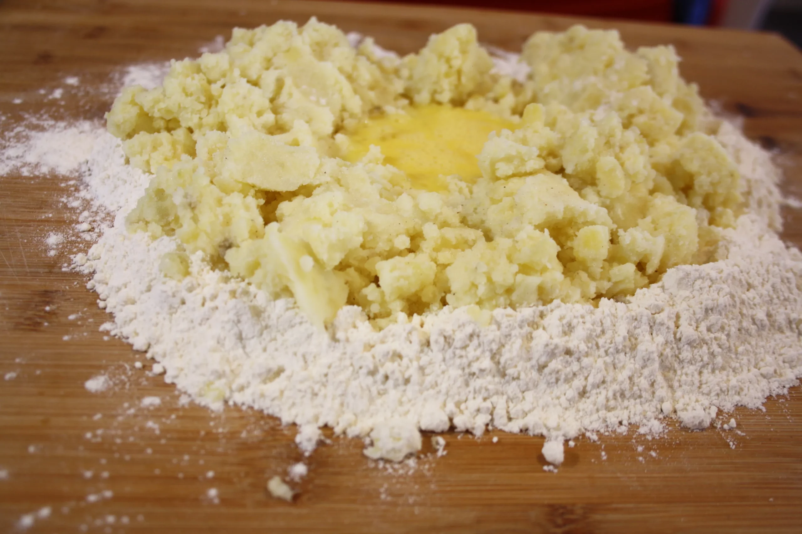 - Damunt de la post on treballarem hi col·locam la farina en volcà. Enmig del clot hi posam la patata esclafada i trempada i, al capdamunt, un ou batut.