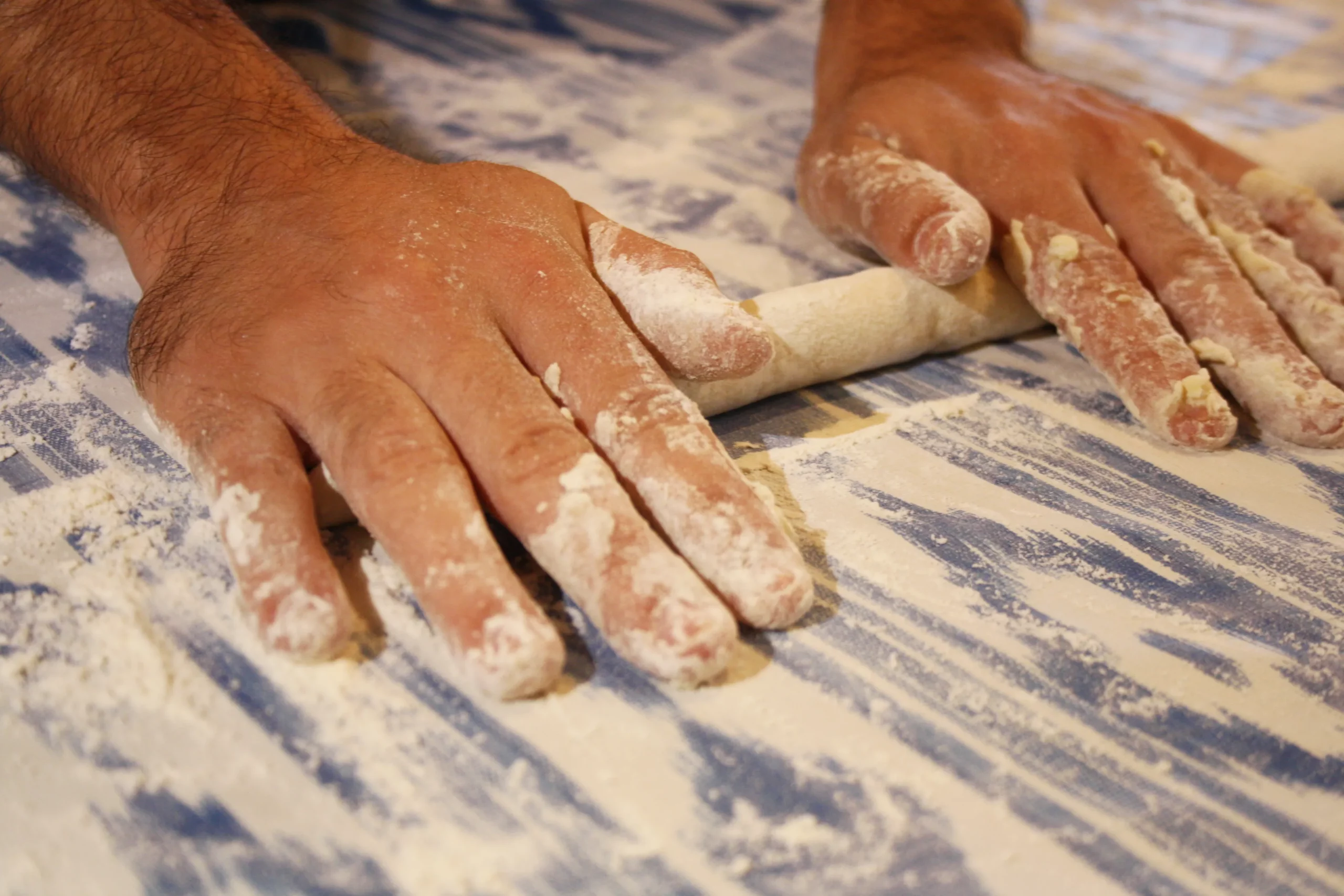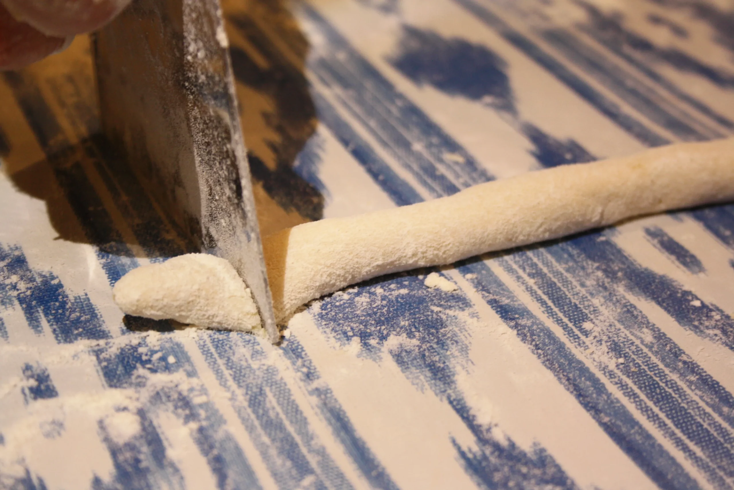 - Prenem una porció de la pasta més o manco petita i començam a donar-li forma cilíndrica, ajudant-nos amb les dues mans. El diàmetre del cilindre pot variar al gust de cadascú -com més gruixat sigui, més grossos seran els gnocchi-; una bona mesura és 1 cm, aproximadament.