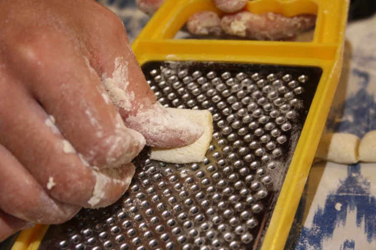 - Ara ve la part més divertida: prenem un ratllador de formatge i, per la part de darrera, feim força amb el polze damunt una de les porcions. Hem de fer força cap avall, de manera que es creï un petit espiral de pasta amb la forma dels forats a l’exterior. És més mal d’explicar que de fer!