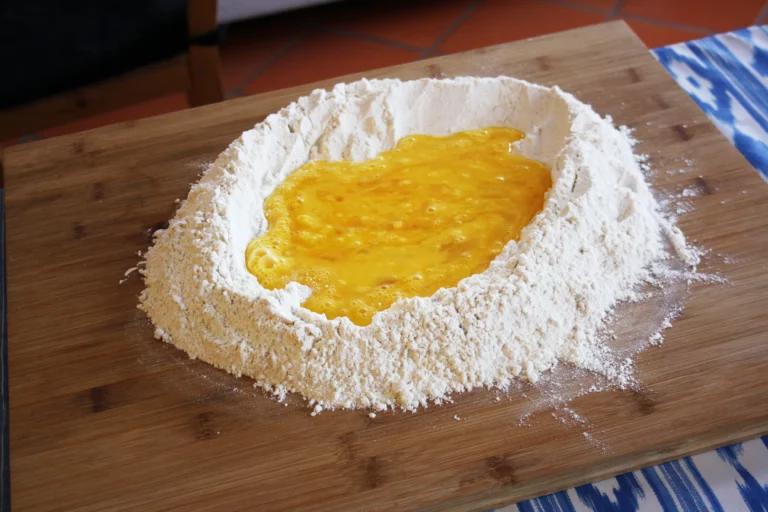 - Preparam una post de fusta on amassar la farina amb els ous. Feim un volcà de farina amb els ous enmig i ho pastam fins que obtinguem una massa homogènia.