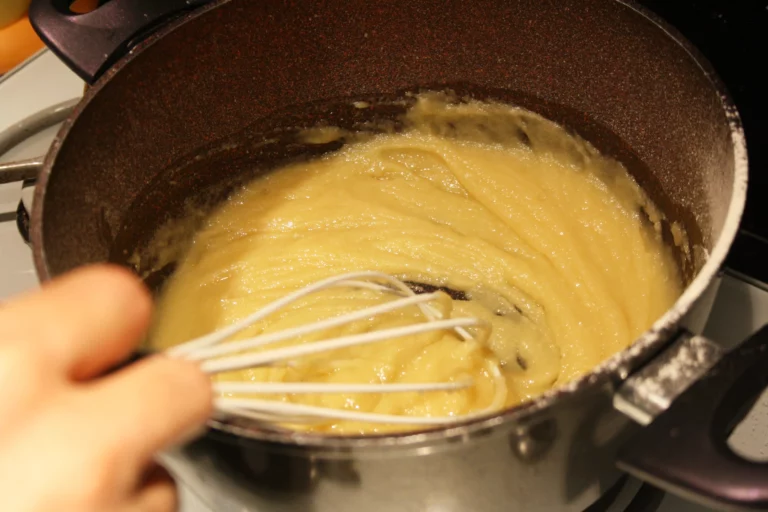 - Mentre la posta reposa podem preparar la beixamel. Fonem la mantega en una olla grossa. Abocam la farina i la torram fins que la mescla s’enrosseixi.