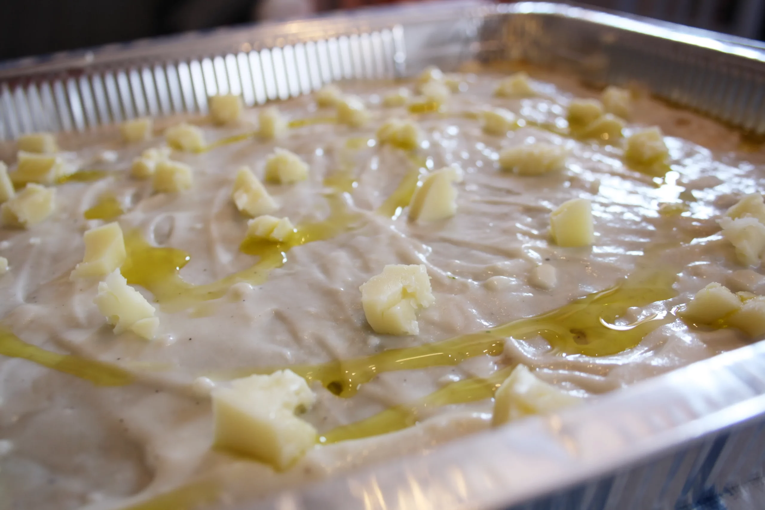 - La darrera capa ha de ser de beixamel. Hi afegim també qualque bocí de formatge (nosaltres hem fet servir formatge Asiago), que es fondrà durant la cocció. Amb un raig d’un bon oli d’oliva acabarem de completar el plat.