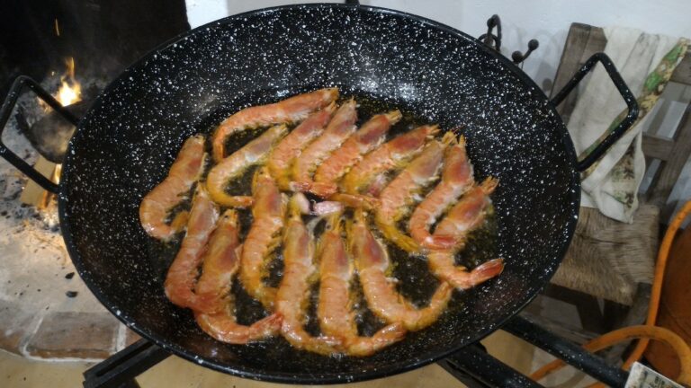 - Posam un bon roll d'oli al calderó, amb tres o quatre alls, i ho posam al foc. En ser ben calent, hi tiram les gambes, amb un polsim de sal, i les feim coure cinc minuts per cada banda. En ser cuites, les enretiram a dins un plat.
