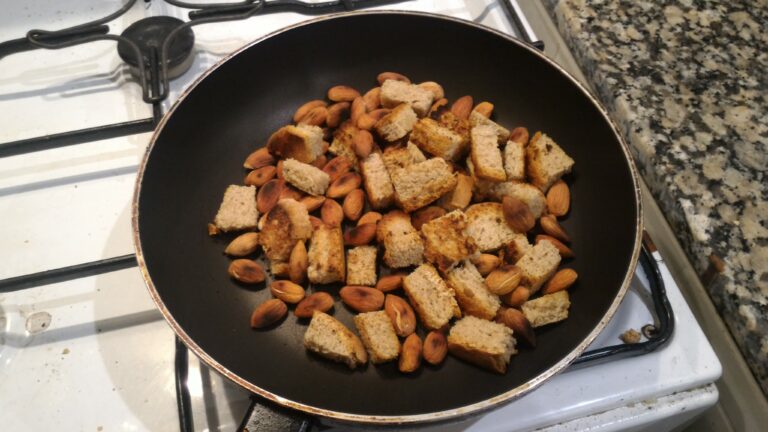 - Preparam la picada. En una paella, torram les ametles amb el pa tallat a daus.
