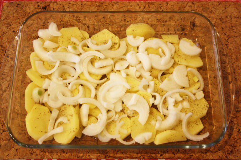 - Feim un sostre de patates tallades a rodanxes (no massa primes), i les salpebram. Afegim les cebes tallades a la juliana.