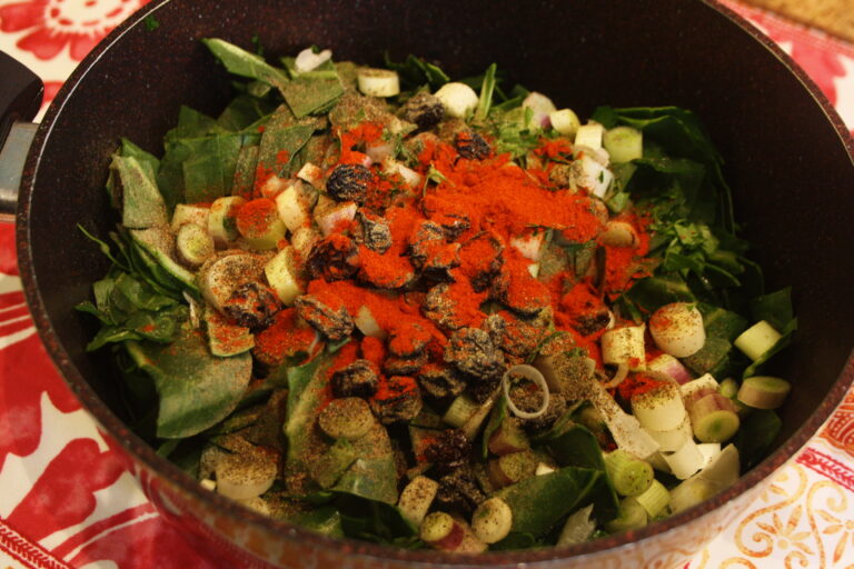 - Tallam les bledes, les cebes tendres i el julivert en bocins petits (però no massa) i els abocam en un recipient, juntament amb les panses.