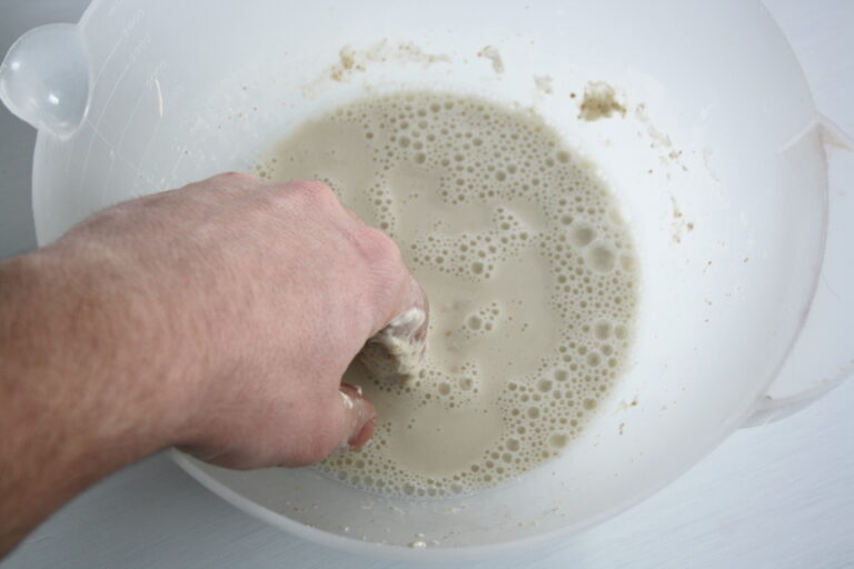 - Fonem el llevat amb tota l’aigua tèbia. Afegim la mescla de farines a poc a poc, i ho anam pastant fins que l’hàgim incorporada tota.