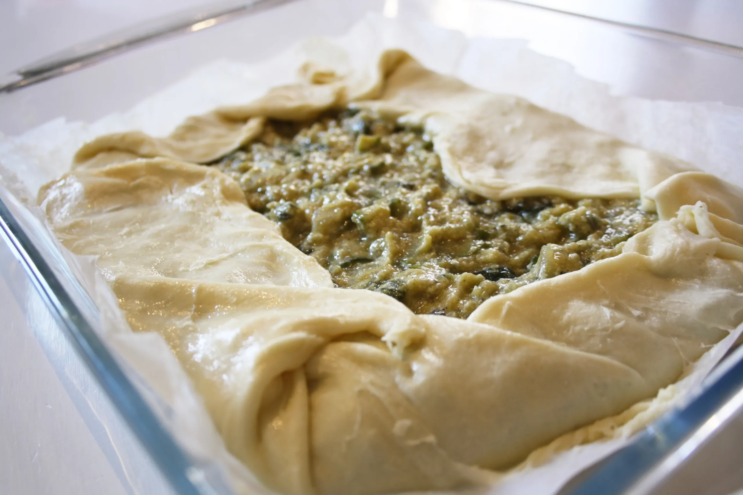 6. Abocau el farcit que hem preparat i escampau-lo de manera uniforme. Plegau cap endins les puntes de pasta que sobresurtin.