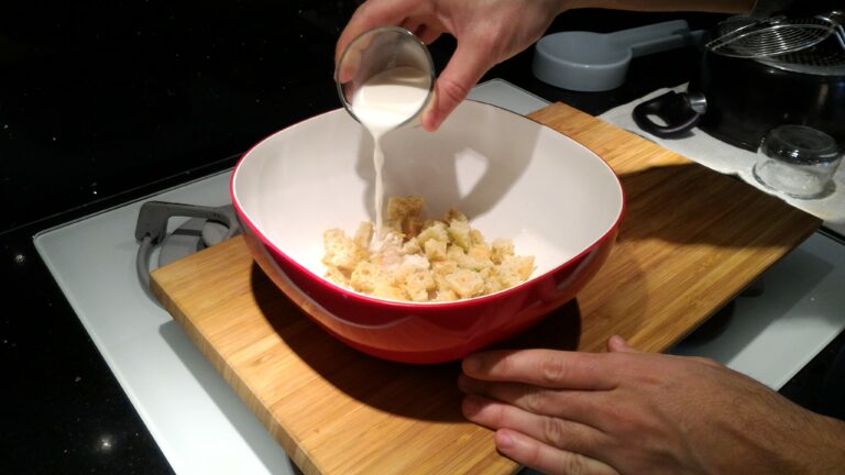 - Amb una mà, prenem una grapada de pa i l’estrenyem dins el puny per treure’n l’excés de llet. Volem el pa humit, però no xop. Afegim el pa a la mescla anterior.