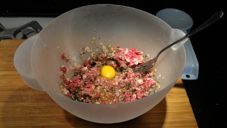 - En un bol, mesclam la carn capolada, la mortadel·la, la picada i un ou. Ho salpebram bé, al gust.