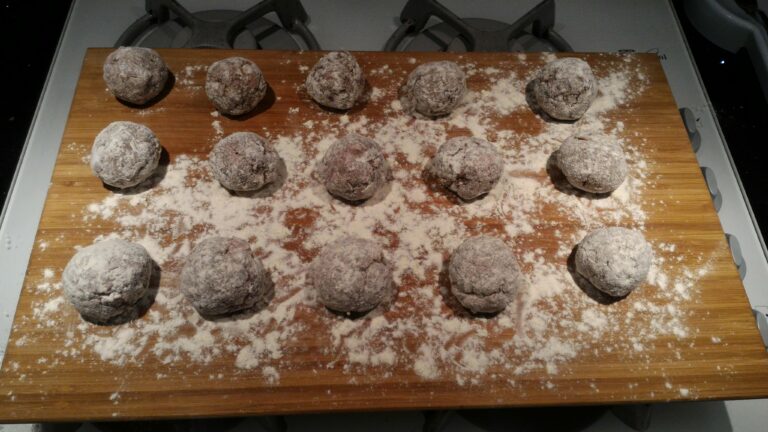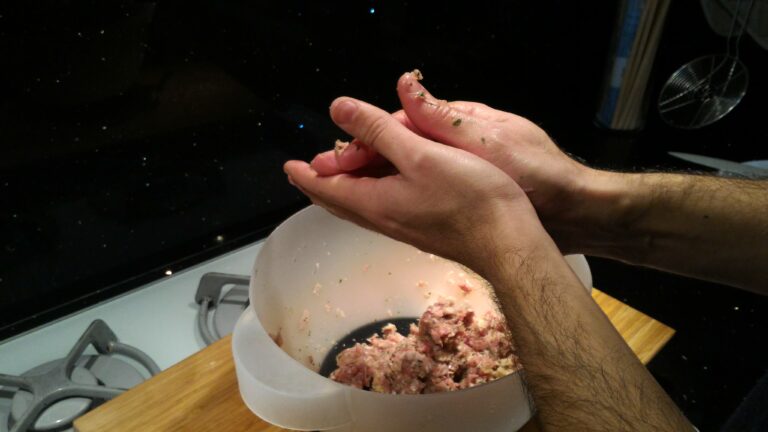 - Una vegada tenim el farcit, només ens queda fer les pilotes. Simplement, prenem un poc de farcit i li dam forma amb les dues mans.