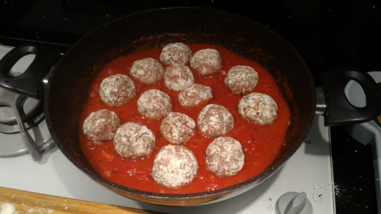 - Afegim tot d’una un tassó de vi blanc, i ho feim coure fins que vegem que la salsa pren cos i que les pilotes són cuites. Hem de remenar de tant en tant, assegurant-nos de girar les pilotes. Segons la mida, seran cuites en 15-20 minuts.