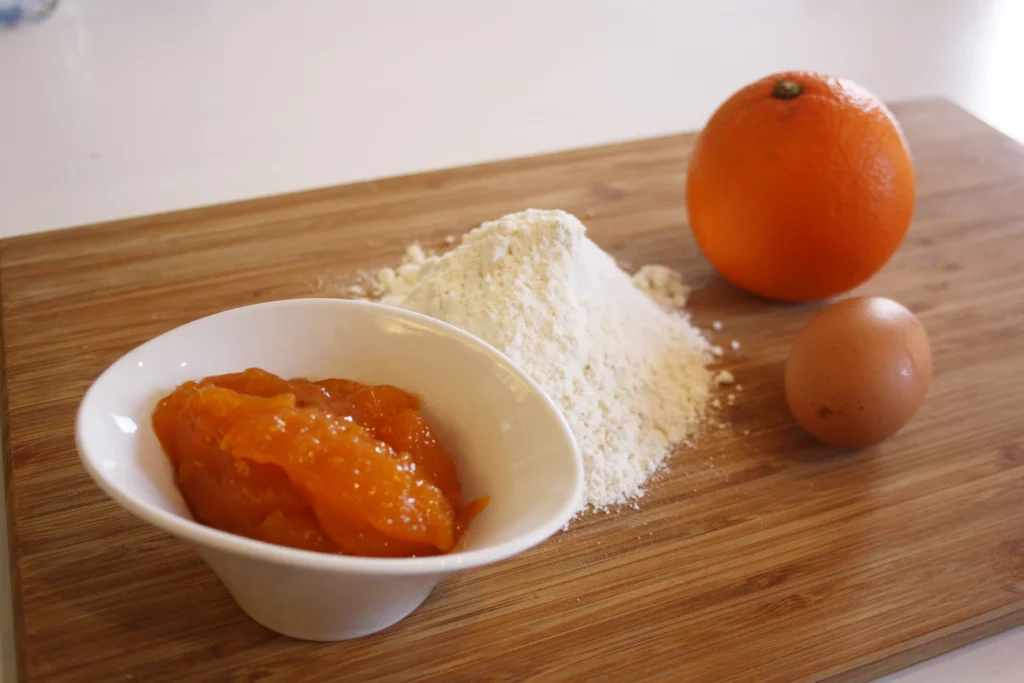 - Començam per fer la pasta. Mesclam el saïm (a temperatura ambient o mig fos al microones), els vermells d’ou, l’oli, la llet i el suc de taronja amb el sucre. A continuació afegim la farina a tongades, no tota de cop.