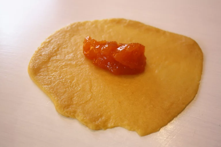 - Començam a fer els robiols. Prenem una bolla de pasta d’uns 75 grams i l’aplanam amb un aprimador. Ha de ser prima però no massa perquè no s’espenyi en doblegar el robiol. Posam una cullerada de farcit (en el nostre cas, confitura) enmig de la pasta.