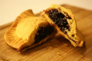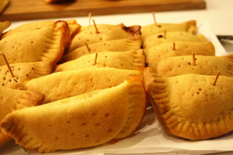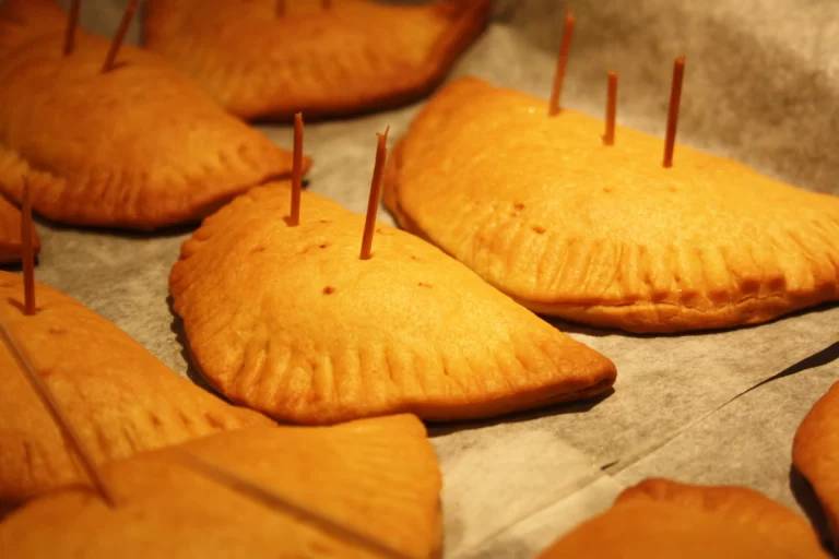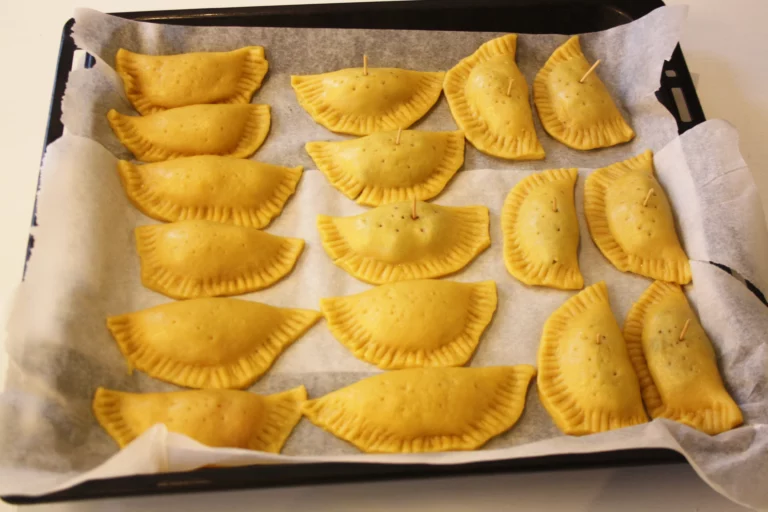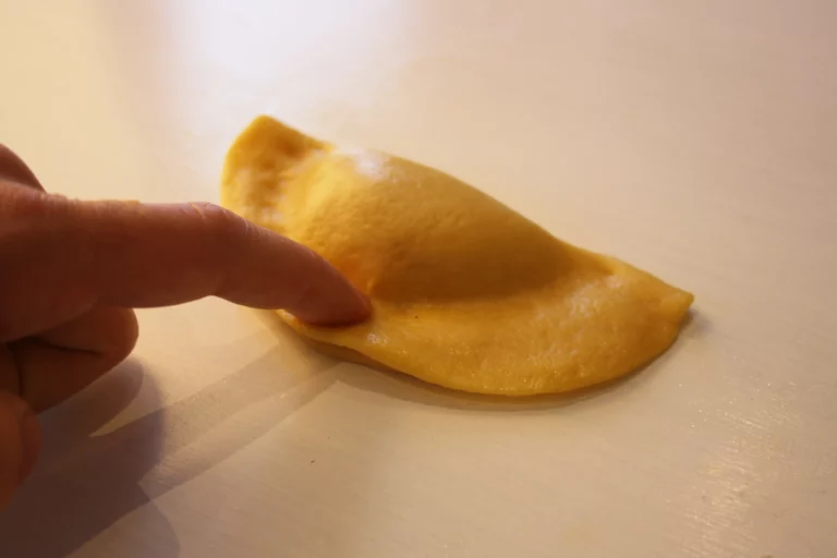 - Doblegam la pasta en forma de mitjalluna. Amb un rodet retallam el sobrant de pasta. Hem de tenir cura de deixar devers un dit de pasta voltant el farcit: si tallam massa arran el farcit sortirà. Amb el dit feim pressió per tancar bé la zona d’unió.