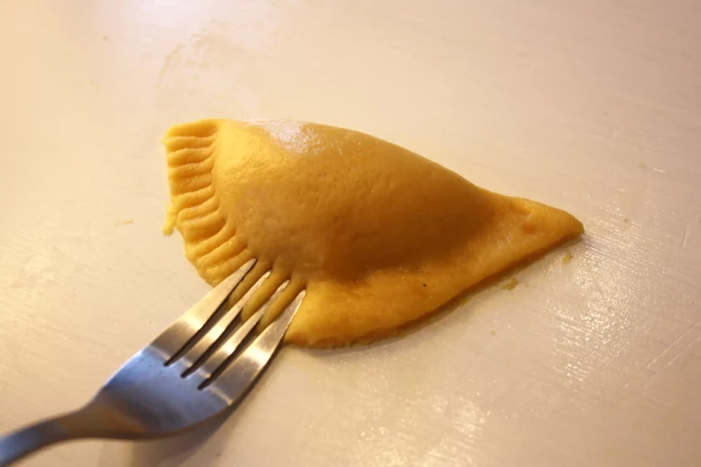 - Amb una forqueta marcam les voreres del robiol: això serveix d’element decoratiu (podem fer diferents senyes per diferents farcits) i, sobretot, evita que el farcit surti durant la cocció.
