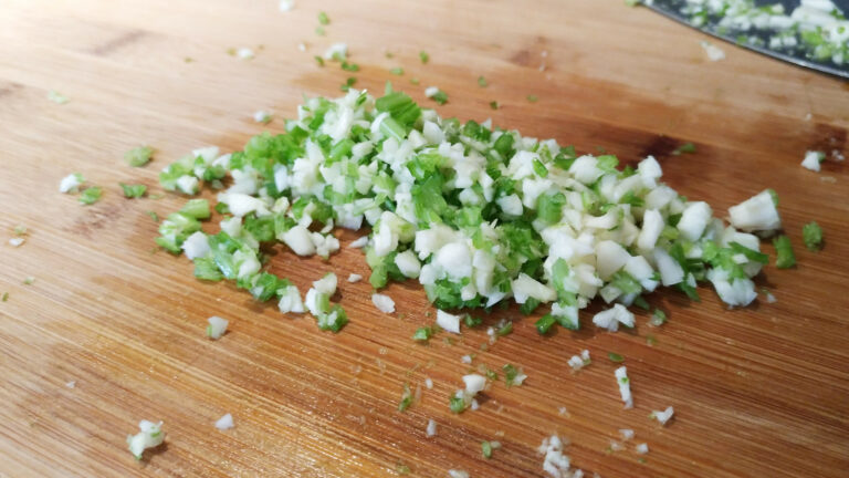 - Preparam una picada amb els tronxos del julivert i l’all, ben capolat.