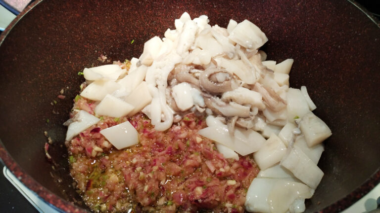 - Continuam la cocció fins que la sípia torni blana. Corregim de sal i pebre bo si cal.